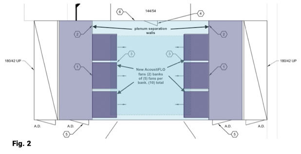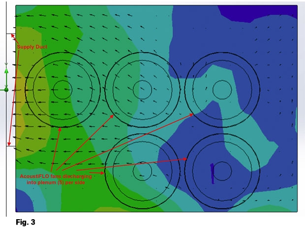 To confirm aerodynamic performance, AcoustiFLO created a graphic CFD analysis of the resultant flow in the plenum with (10) fans discharging into the plenum (Fig.3)